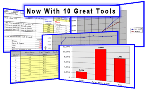 Accurately determine optimal press settings to achieve part to part consistency with this combination of 10 worksheets. Includes the Viscosity/Flow Rate Curve Worksheet, Velocity Linearity Curve Worksheet, Pressure Loss Curve Worksheet, Gate Seal Curve Worksheet, Reynolds/Turbulent Flow Worksheet, Maximum Injection Velocity from Cubic Volume Worksheet and Percentage to Pressure Tables.